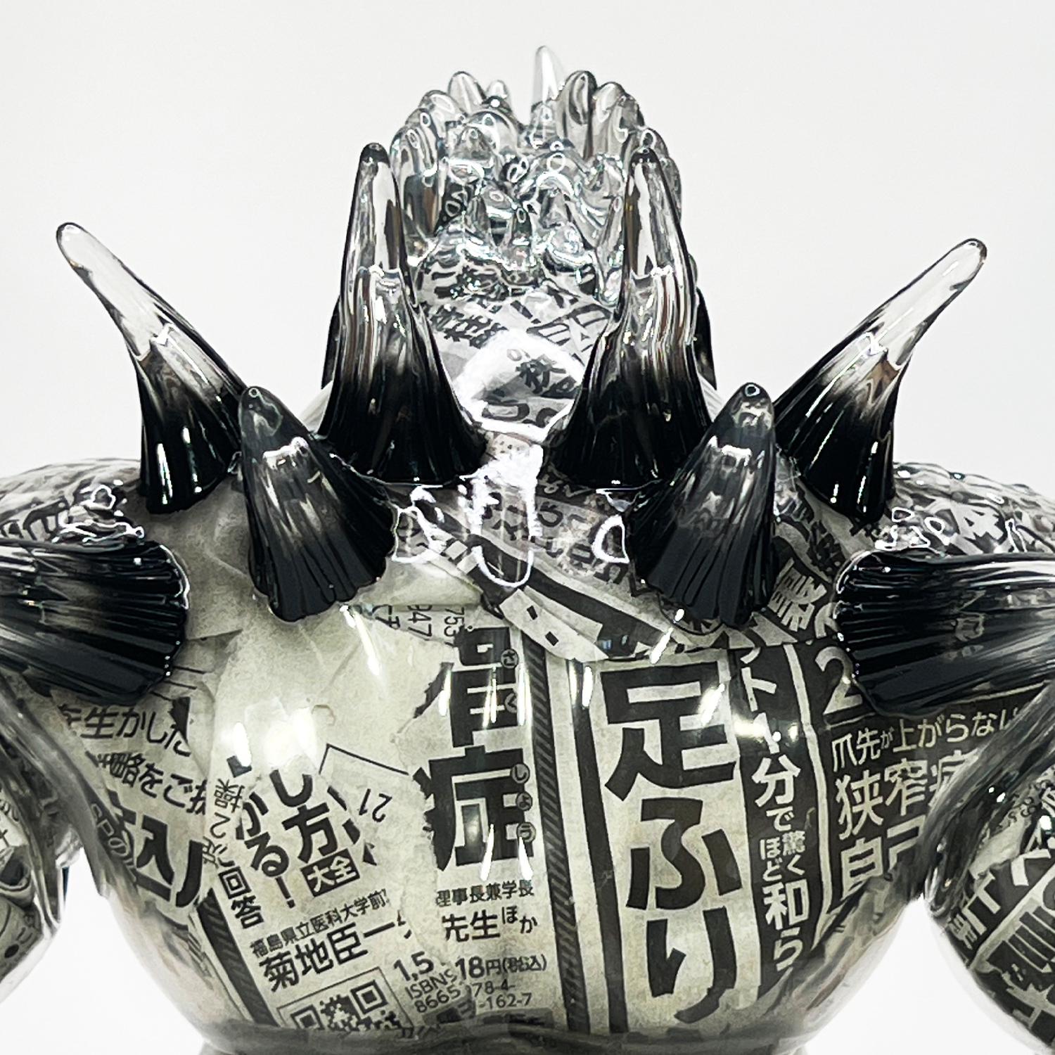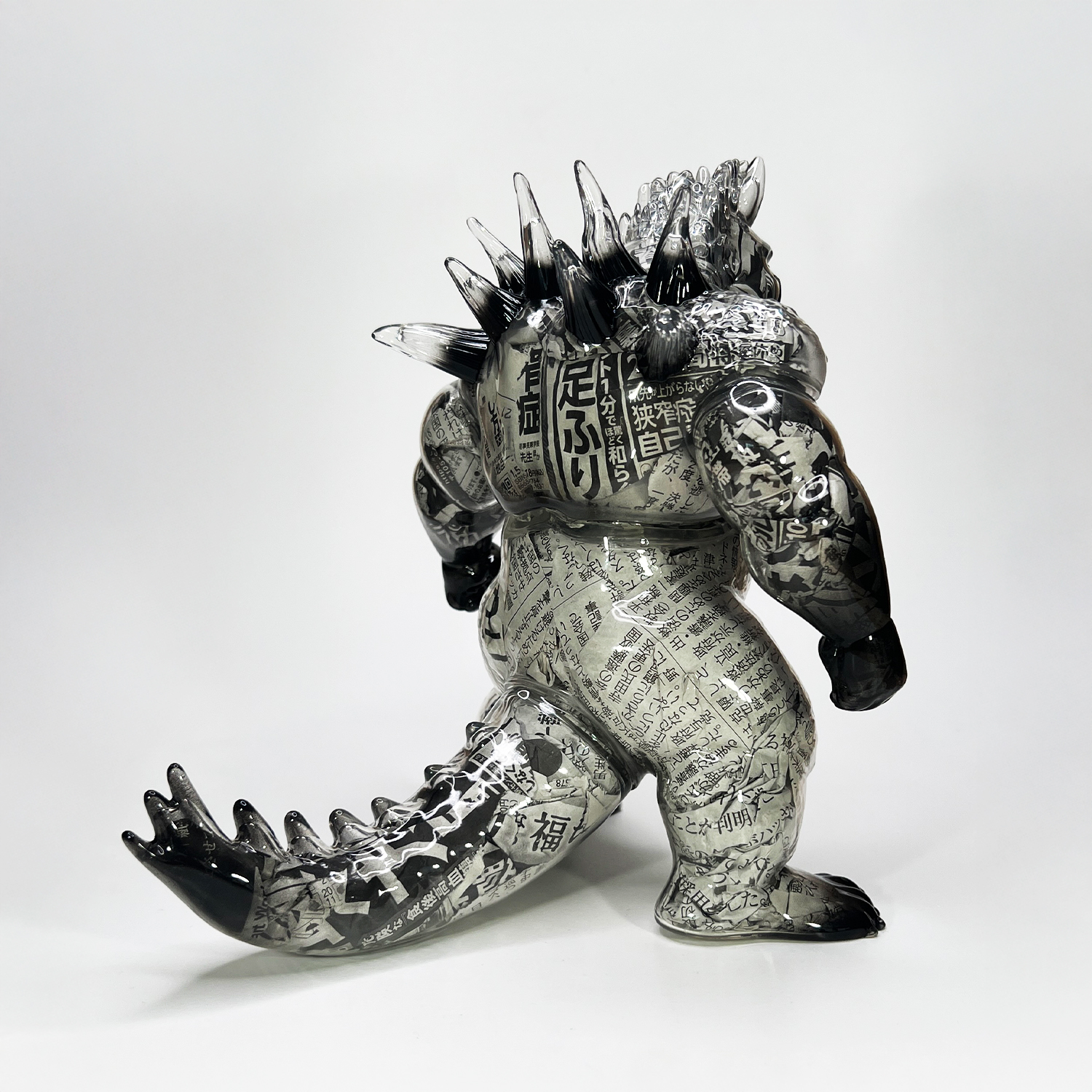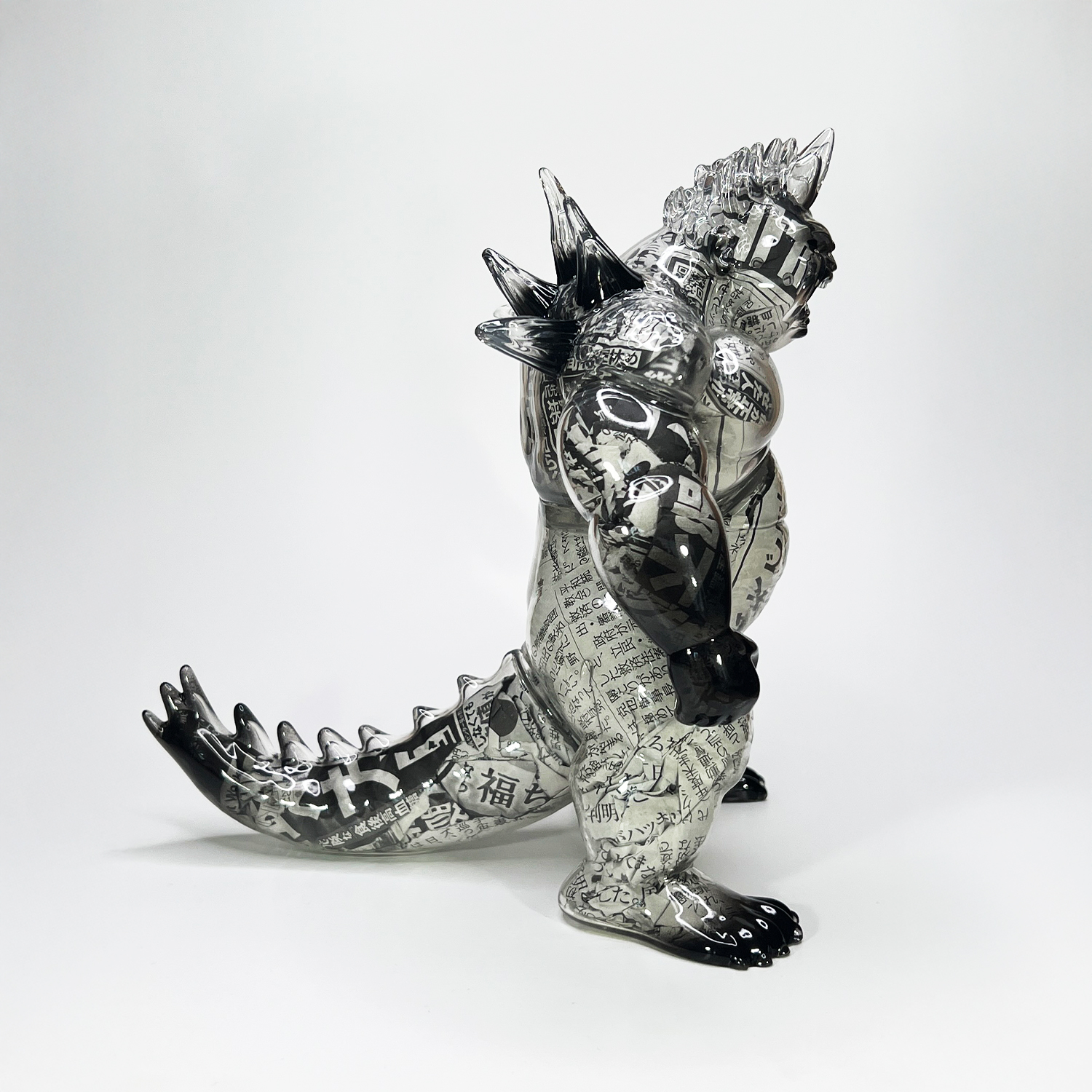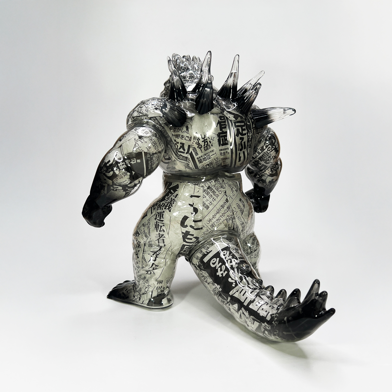 Fightzilla by Ulyss3s is a reinterpretation of the iconic kaiju–sumo hybrid. In this Open Edition, the 6Forest Team transforms the 21 cm sofubi figure into a striking piece titled News, created with layers of real newspaper clippings. Finished with an ultra-glossy varnish, the surface achieves a crystal-like appearance that enhances the depth of the collage. Produced in a traditional Japanese sofubi workshop in Tokyo, this edition merges artisanal vinyl techniques with experimental contemporary aesthetics, offering collectors a fresh and ever-evolving interpretation of Fightzilla.