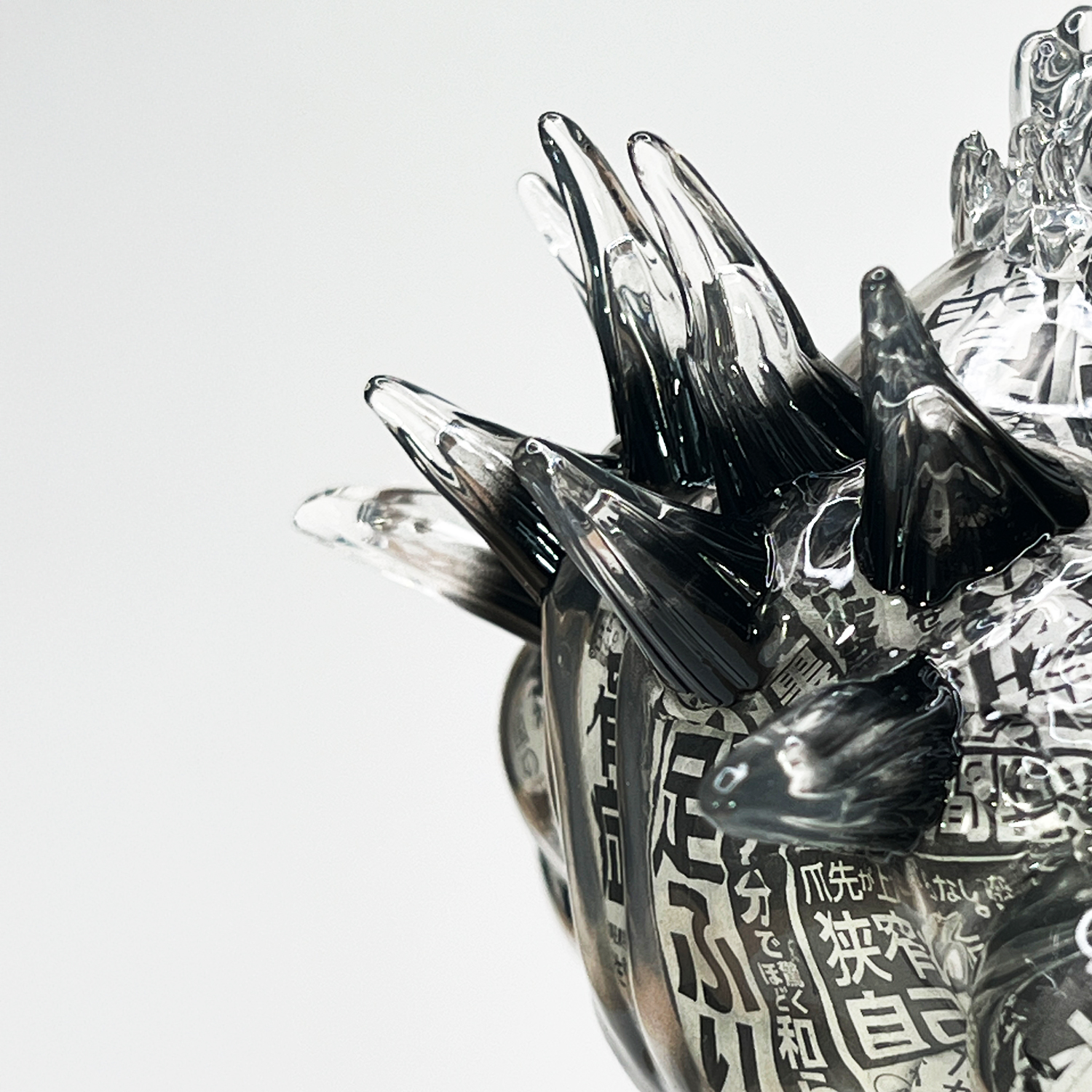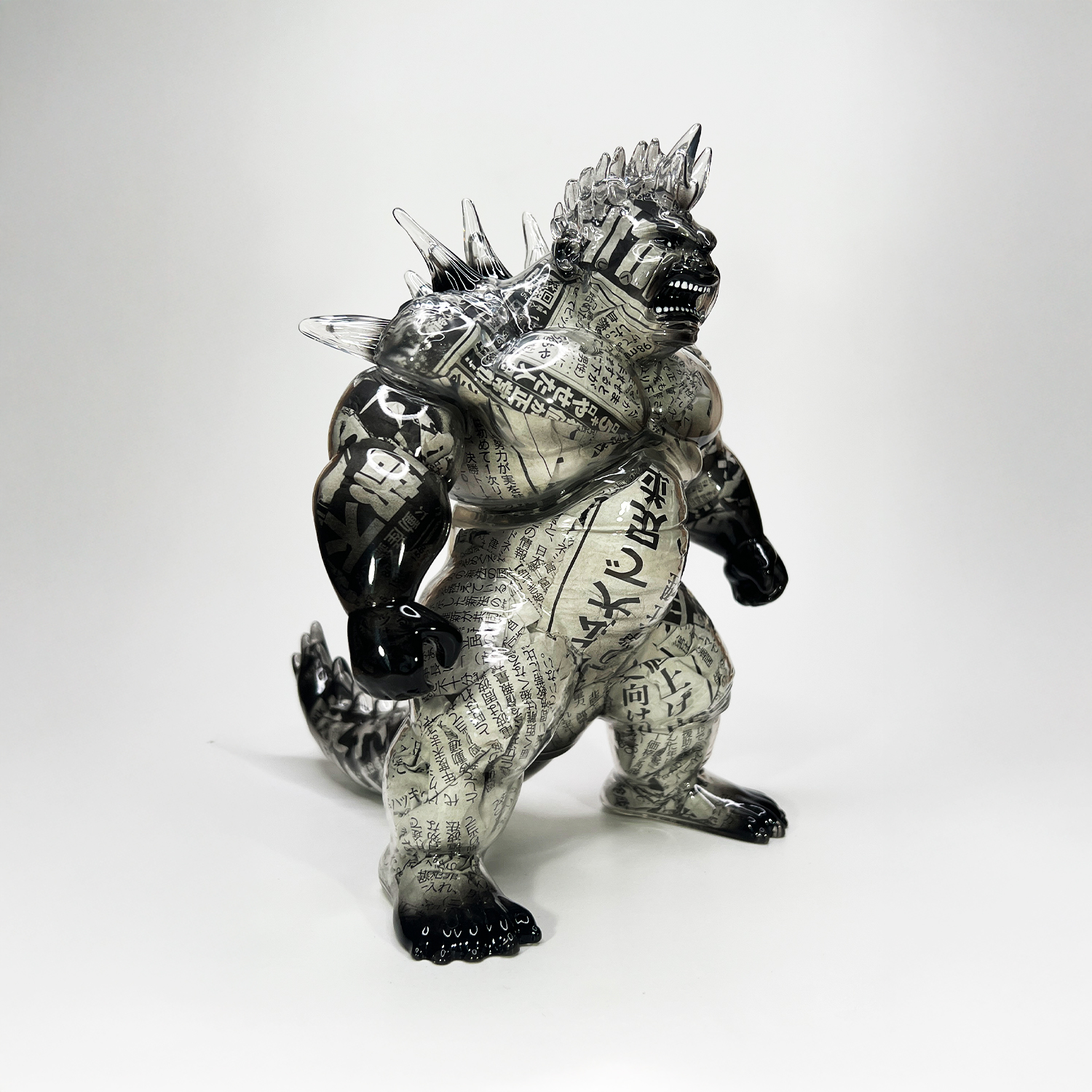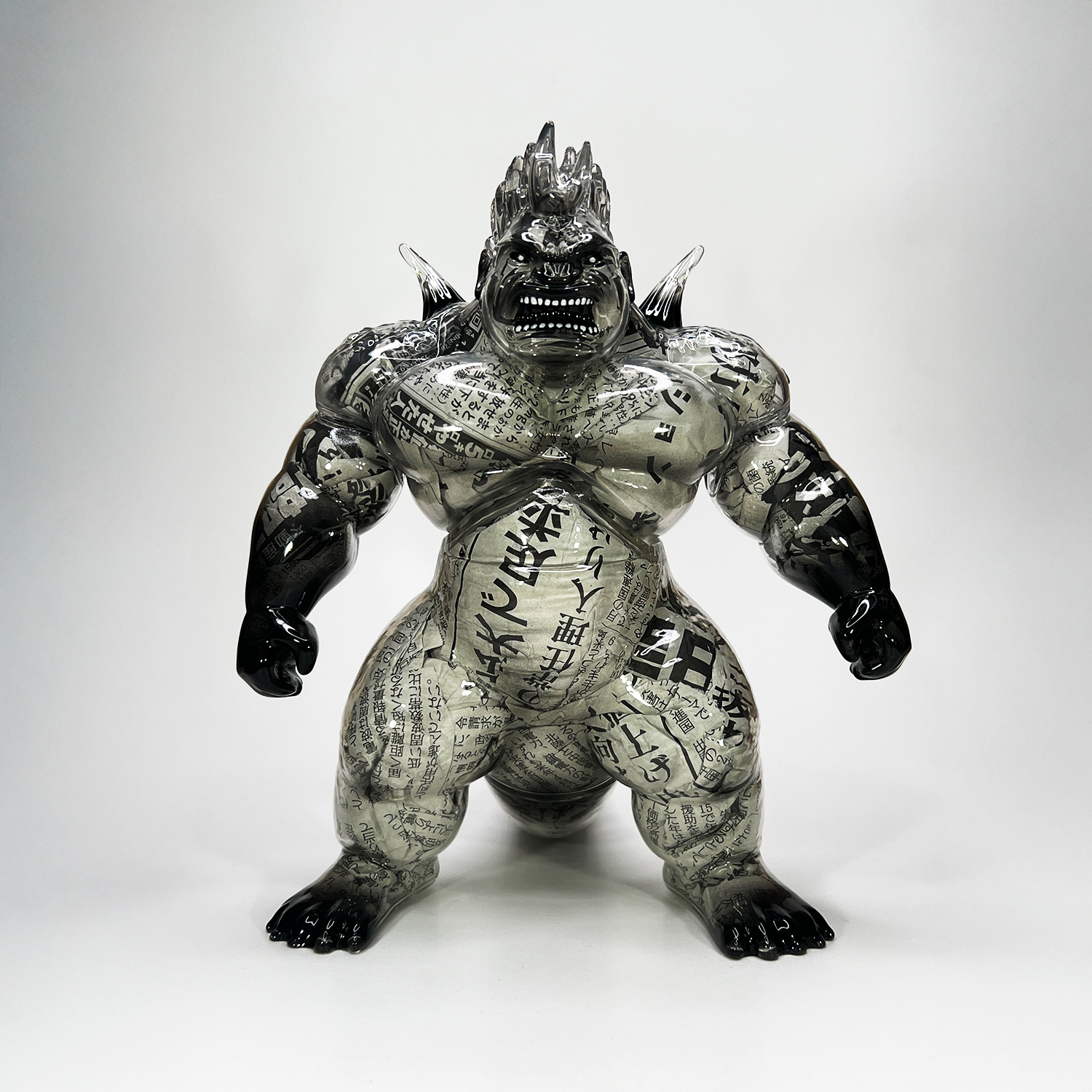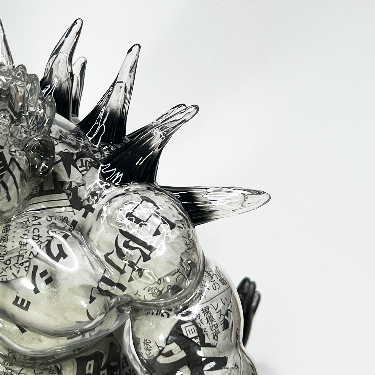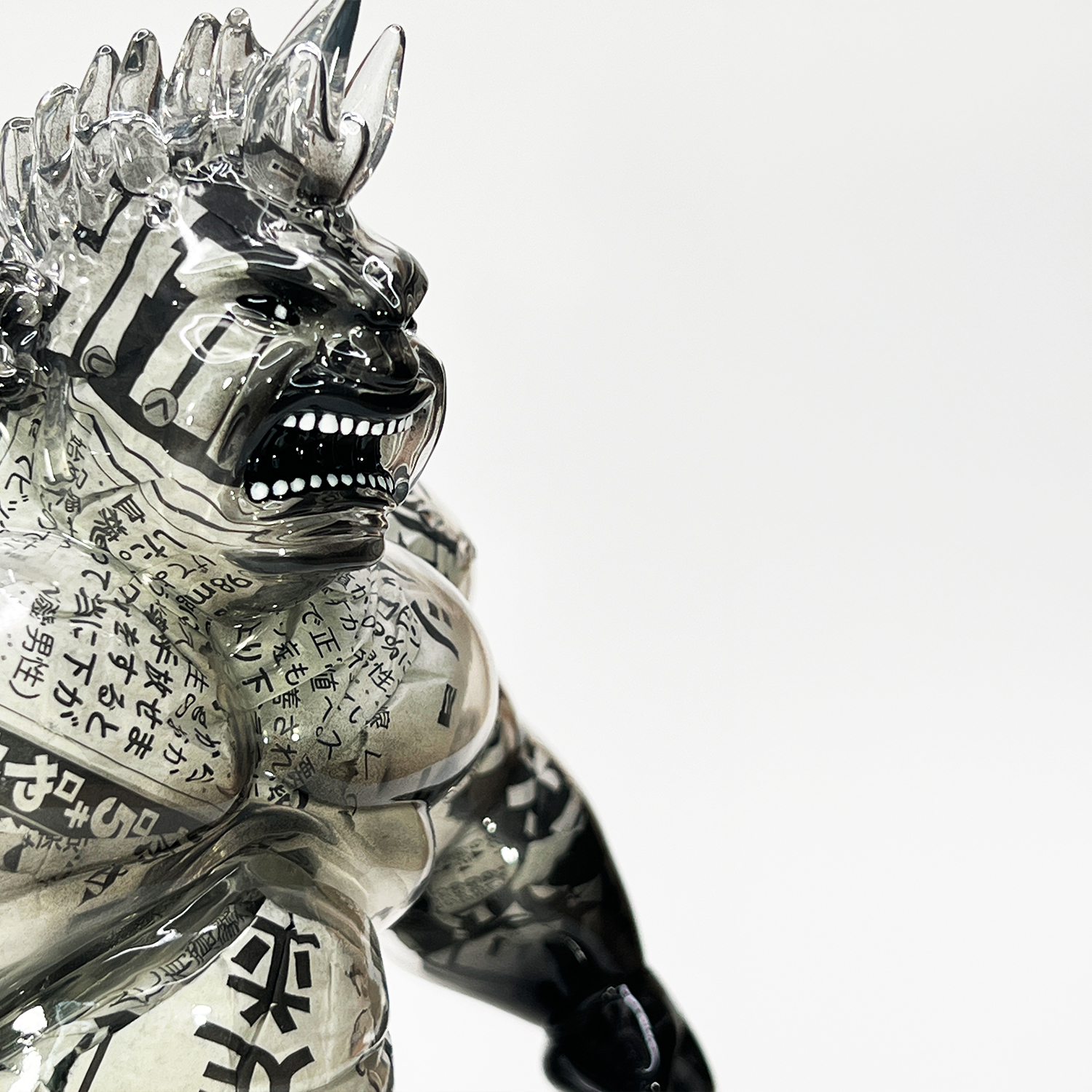 Fightzilla by Ulyss3s is a reinterpretation of the iconic kaiju–sumo hybrid. In this Open Edition, the 6Forest Team transforms the 21 cm sofubi figure into a striking piece titled News, created with layers of real newspaper clippings. Finished with an ultra-glossy varnish, the surface achieves a crystal-like appearance that enhances the depth of the collage. Produced in a traditional Japanese sofubi workshop in Tokyo, this edition merges artisanal vinyl techniques with experimental contemporary aesthetics, offering collectors a fresh and ever-evolving interpretation of Fightzilla.