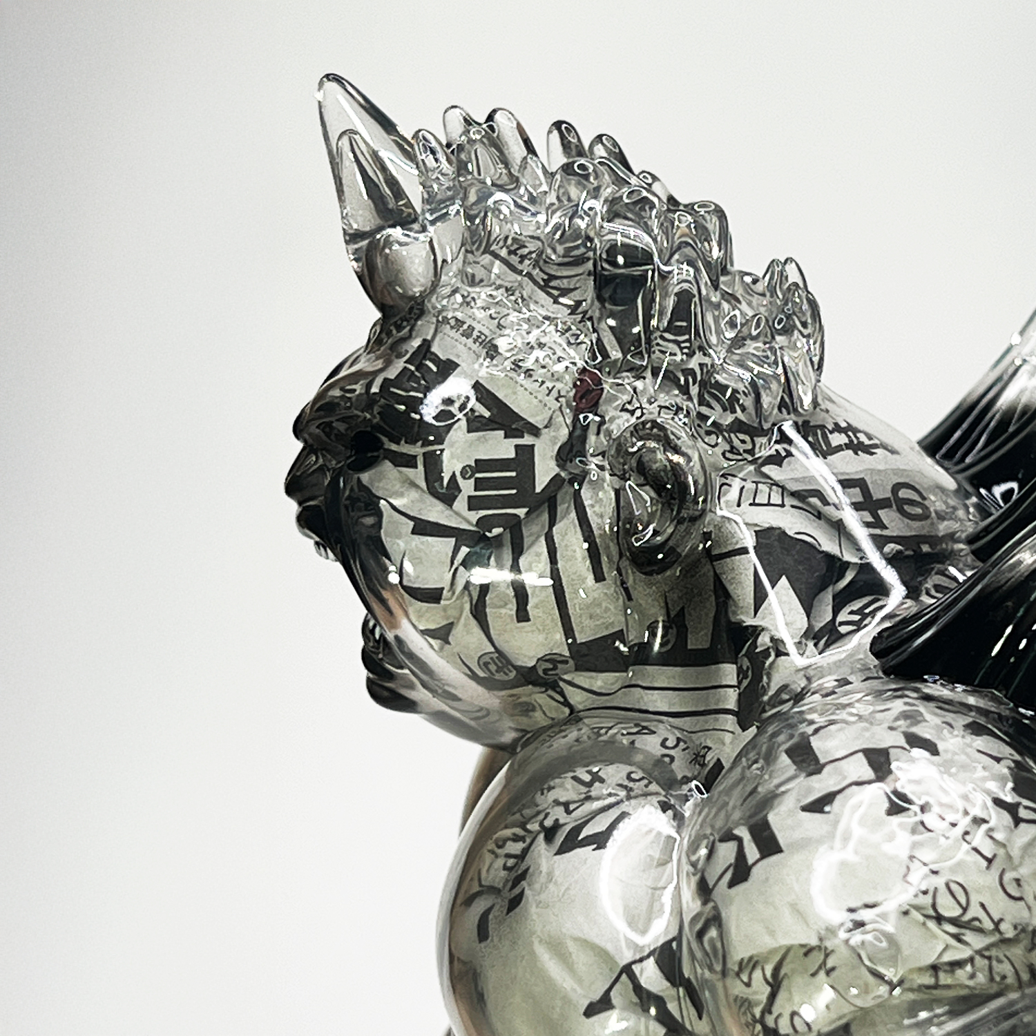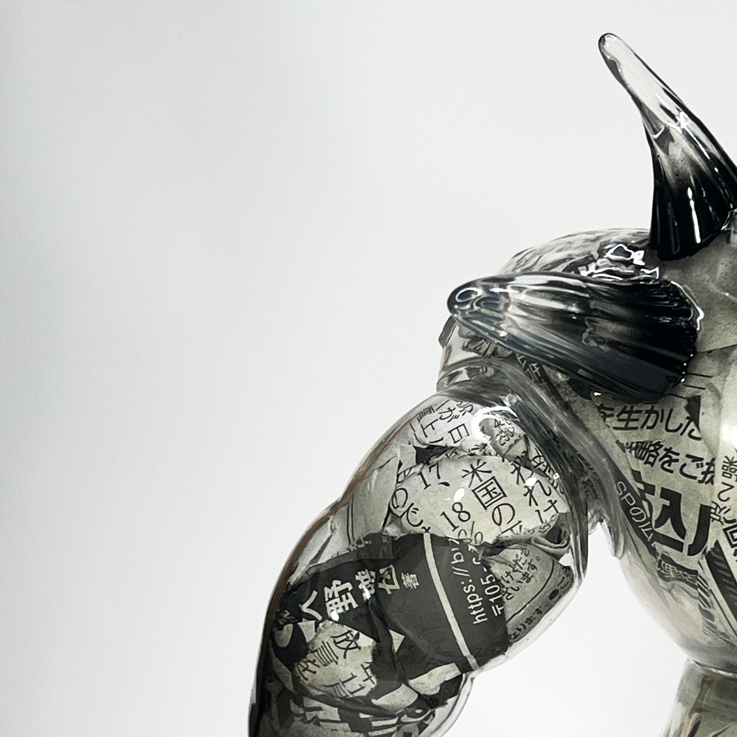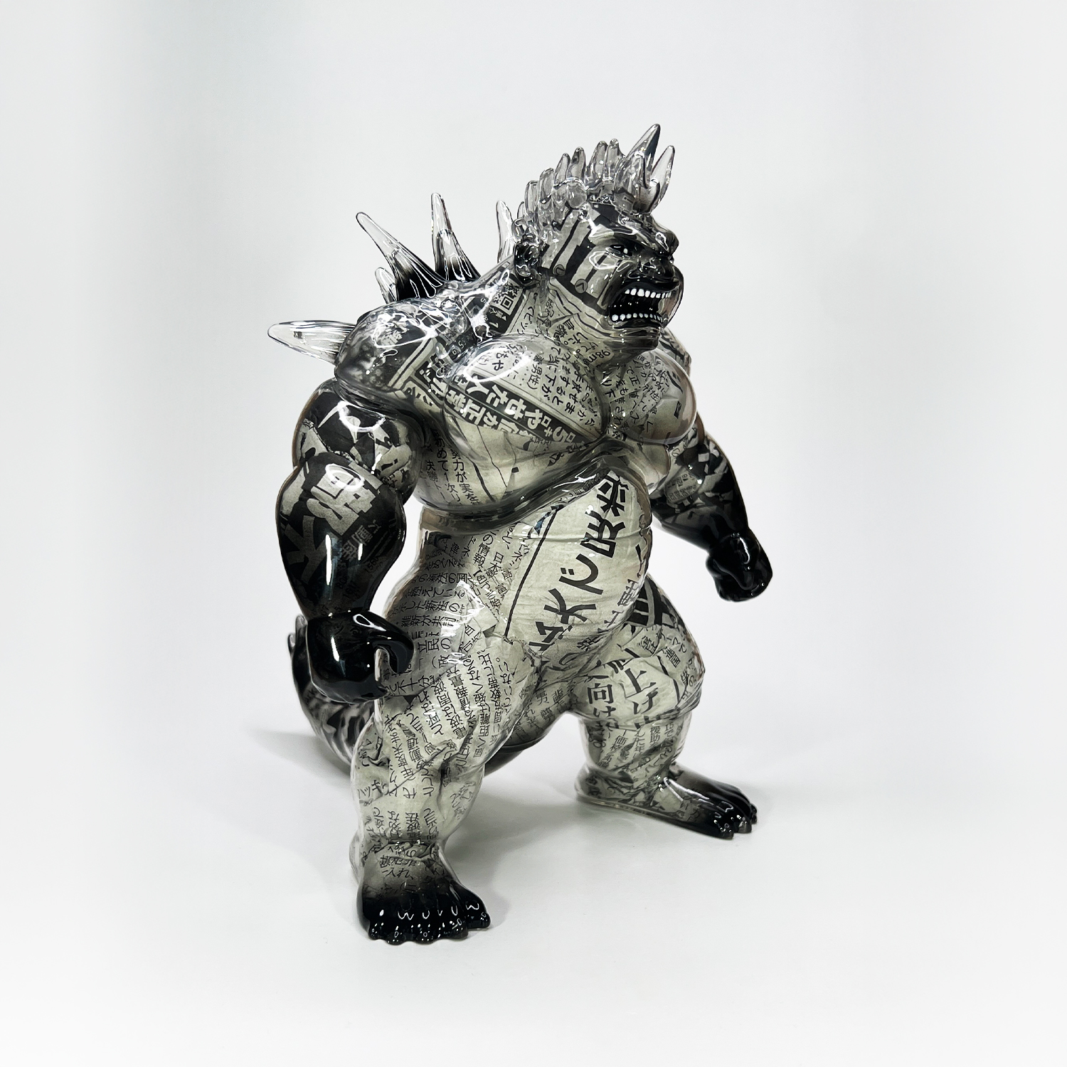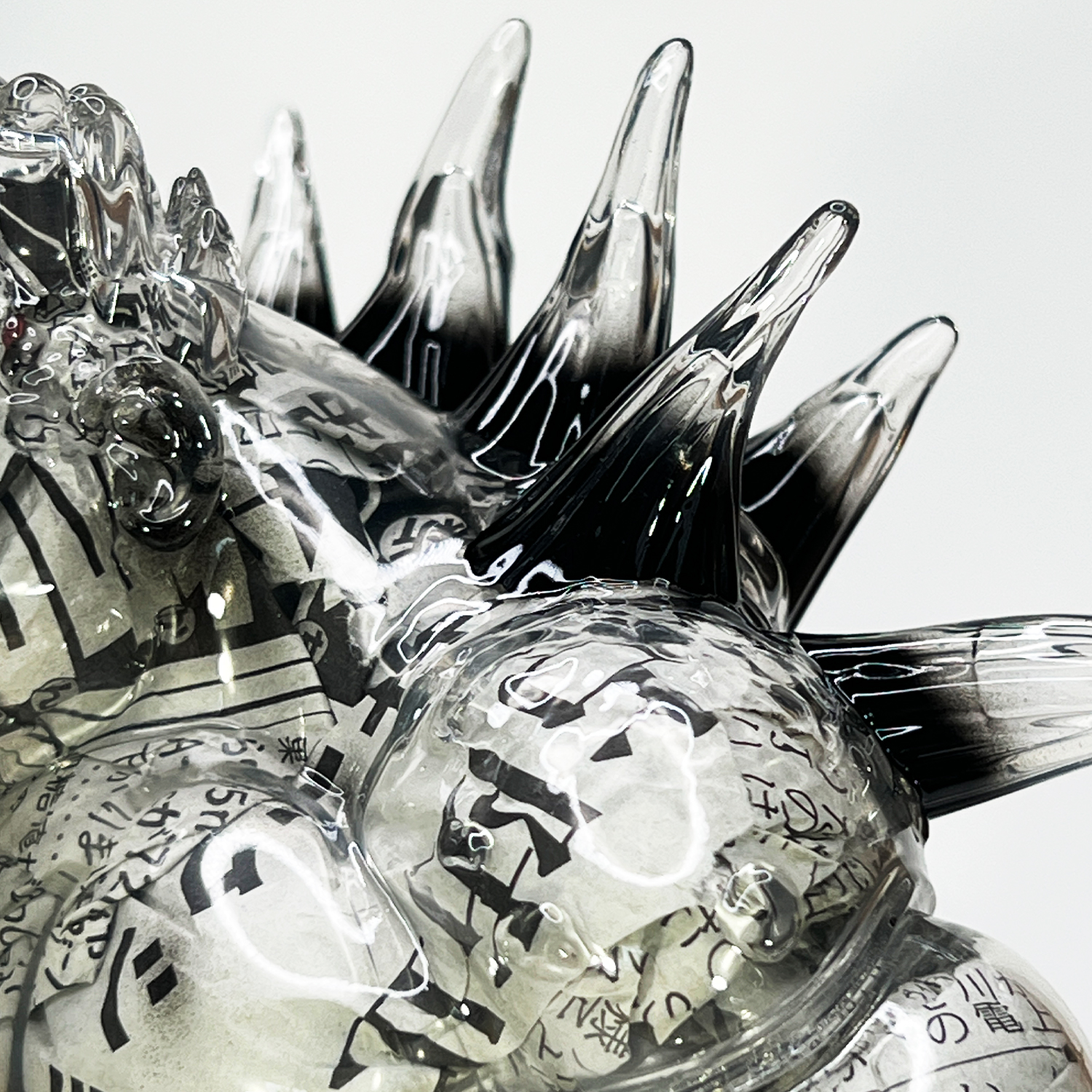 Fightzilla by Ulyss3s is a reinterpretation of the iconic kaiju–sumo hybrid. In this Open Edition, the 6Forest Team transforms the 21 cm sofubi figure into a striking piece titled News, created with layers of real newspaper clippings. Finished with an ultra-glossy varnish, the surface achieves a crystal-like appearance that enhances the depth of the collage. Produced in a traditional Japanese sofubi workshop in Tokyo, this edition merges artisanal vinyl techniques with experimental contemporary aesthetics, offering collectors a fresh and ever-evolving interpretation of Fightzilla.